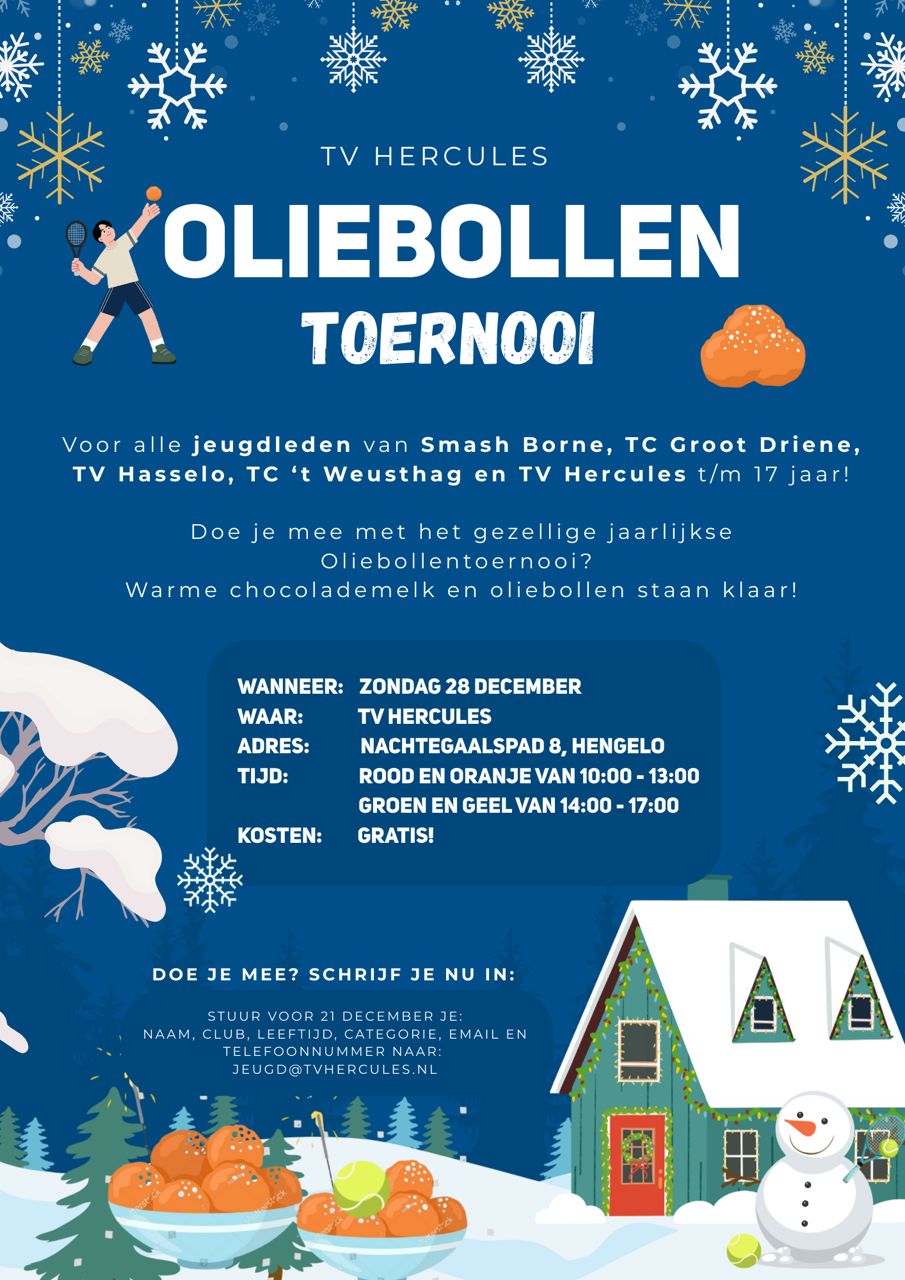 Voor alle jeugdleden t/m 17 jaar oud van Smash Borne, TC Groot Driene, TV Hasselo, TC 't Weusthag en uiteraard TV Hercules organiseren we op zondag 28 december het Oliebollentoernooi.