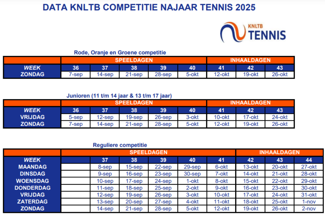 de KNLTB Najaarscompetitie Tennis is van start gegaan. De competitie 2025 begon in week 37, met de eerste speeldag op 8 september 2025, en duurt 5 speelweken, wat neerkomt op wedstrijden tussen half september en half oktober. Hou dus rekening met beperkt tot zeer beperkte ruimte voor recreatief tennis op de donderdag- en vrijdagavond, de zaterdag en de zondag (overdag).