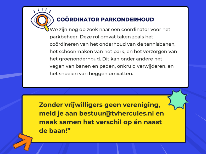 En zoals aangegeven in het verslag van de Extra ALV zoeken we nog een coördinator voor het parkbeheer. Deze rol omvat taken zoals het coordineren van het onderhoud van de tennisbanen, het schoonmaken van het park, en het verzorgen van het groenonderhoud. Dit kan onder andere het vegen van banen en paden, onkruid verwijderen, en het snoeien van heggen omvatten.